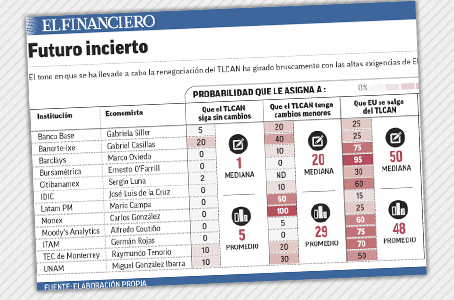 De acuerdo con una encuesta realizada por El Financiero a más de 15 economistas de las principales instituciones financieras y universidades del país, el consenso ve un 50 por ciento de probabilidad que la delegación estadounidense se levante de la mesa de negociaciones.