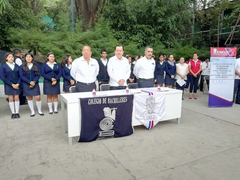 El rector de la UAGro firmó un convenio de colaboración con el director general del Cobach, Fermín Alvarado Arroyo, en presencia del director del plantel 1, Jesús Aurelio Silva Almazán, en el que se comprometen a impulsar apoyos académicos para estudiantes y profesores de ambas instituciones.