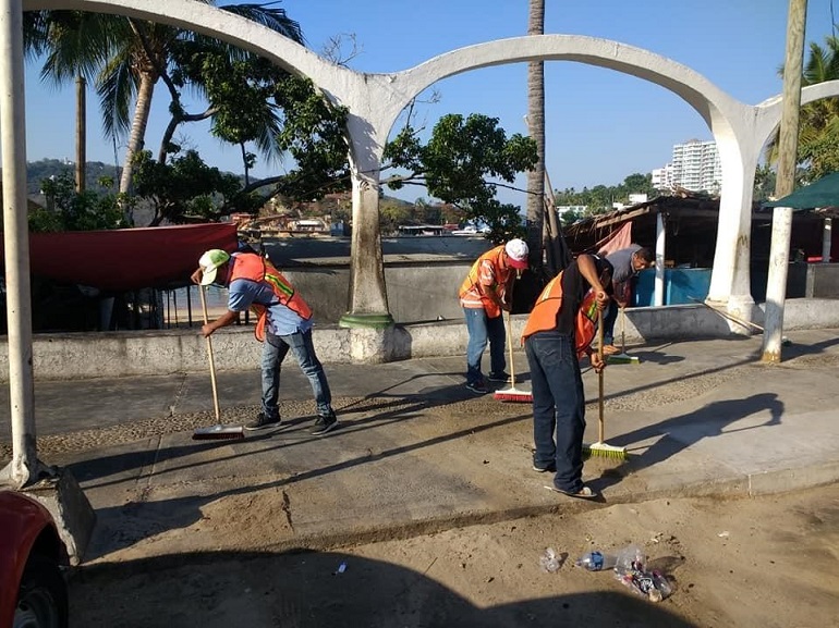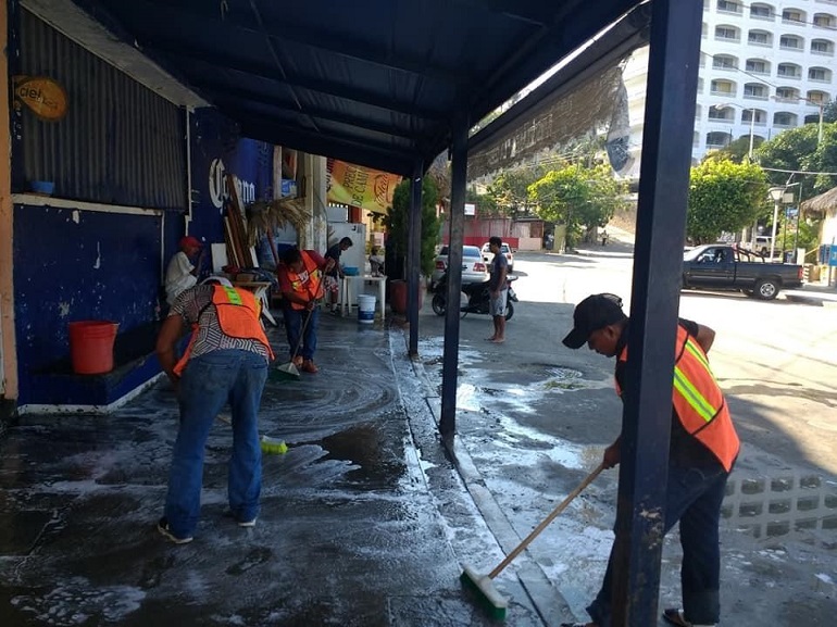 El coordinador, Juan Carlos Manrique García, explicó que temporalmente hombres y mujeres realizan acciones de limpieza como barrido fino, grueso, así como pintado de fachadas sobre la costera Miguel Alemán en el área de Caleta, Caletilla, Tlacopanocha y Manzanillo, además de diferentes accesos a playa.