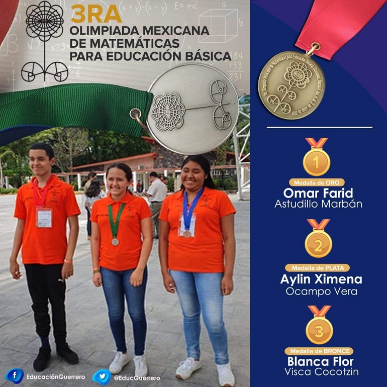 Chilpancingo.- Los estudiantes de segundo de secundaria Omar Farid Astudillo Marbán, Aylín Ximena Ocampo Vera y Blanca Flor Visca Cocotzin, obtuvieron triunfos históricos para el estado de Guerrero en la Tercera Olimpiada Mexicana de Matemáticas para Educación Básica en Oaxtepec, Morelos, donde compitieron con los 200 jóvenes matemáticos más brillantes del país.
