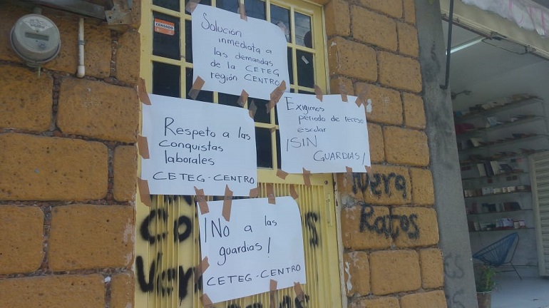 Alrededor de las 12:00 horas, los dirigentes cetegistas Reyna Bello de Jesús y Fredy Gutiérrez Mayo, junto con los maestros, cerraron la Dirección y colocaron pancartas para exigir el respeto a las "conquistas sindicales ganadas".