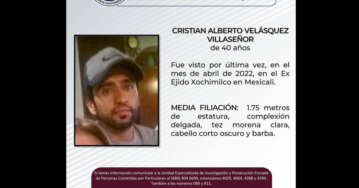 MEXICALI, BAJA CALIFORNIA.- La Fiscalía General del Estado (FGE), a través de la Unidad para la Investigación y Persecución de Delitos de Desaparición Forzadas de Personas y Desaparición Forzada cometida por Particulares, solicita la colaboración de los ciudadanos para localizar a Cristian Alberto Velásquez Villaseñor de 40 años.