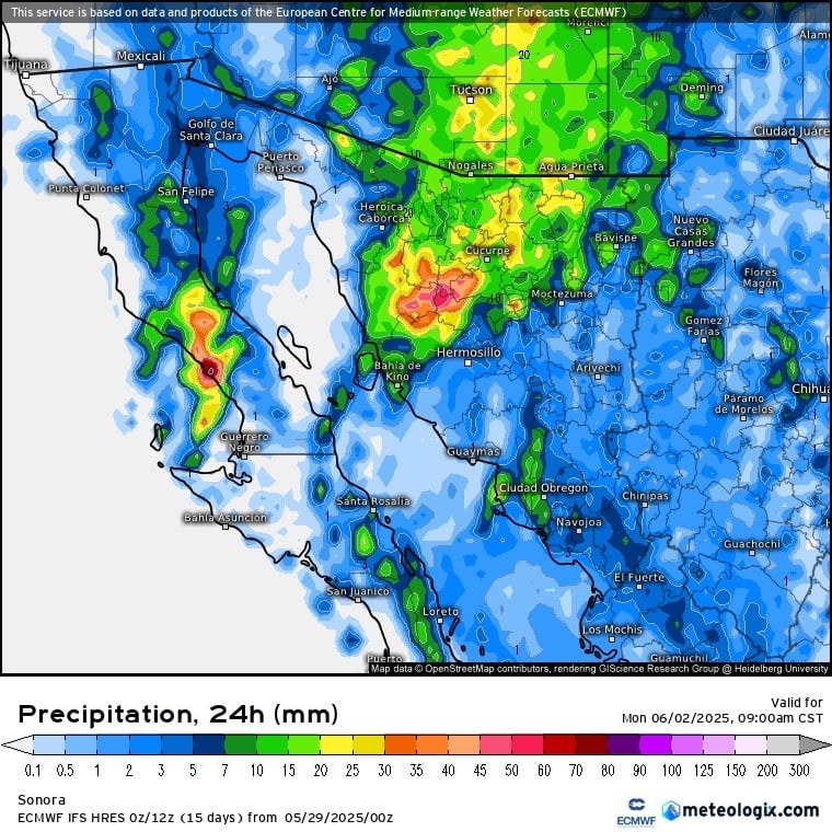 Se pronostican lluvias de moderadas a fuertes, con acumulados de entre 10 y 25 milímetros en Sonora. Estas podrían estar acompañadas de descargas eléctricas y rachas de viento mayores a los 50 km/h.