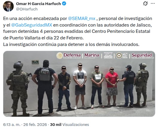 La Secretaría de Marina, en coordinación con el Gabinete de Seguridad federal, detuvo a cuatro de los internos, confirmó el secretario de Seguridad y Protección Ciudadana, Omar García Harfuch.